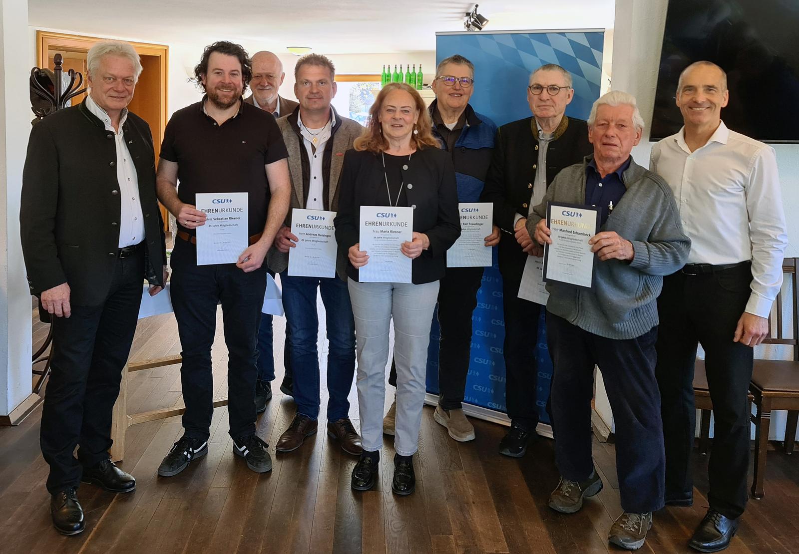 Im Anschluss nahmen Obermeier und MdB Rainer gemeinsam die Ehrung langjähriger Mitglieder vor. Für ein halbes Jahrhundert CSU wurde Manfred Schambeck geehrt; ebenfalls eine Ehrenurkunde erhielten Rudolf Gilch (45 Jahre), Manfred Zahnweh (35 Jahre), Maria Riesner, Karl Staudinger (je 30 Jahre), Andreas Heisinger und Sebastian Riesner (je 25 Jahre).